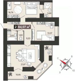 2-комн. квартира от застройщика с предчистовой отделкой в ЖК "8 Марта" на 1 этаже. Общая площадь: 84.07 кв.м., жилая: 30.13 кв.м., площадь просторной кухни-столовой: 21.87 кв.м. Квартира угловая, идеально подойдет любителям тишины и панорамных видов. В квартире одна лоджия, один раздельный санузел. Наличие террасы в квартире открывает возможность для создания зон отдыха в кругу семьи и друзей. Высота потолков 2.7 м.