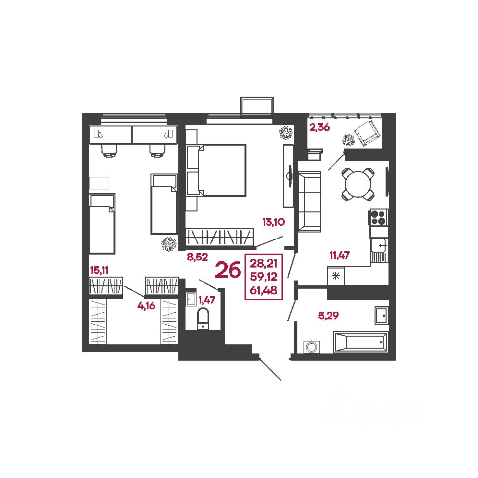 Общая площадь61,48 м²