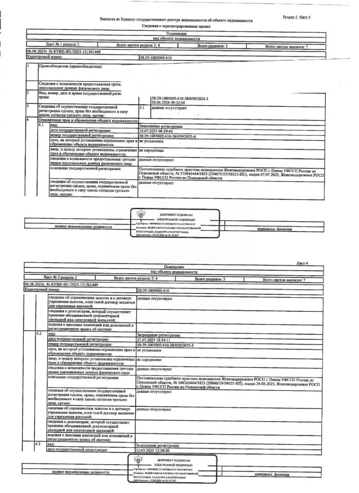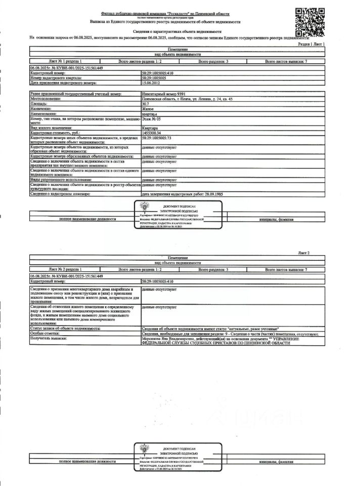 Жилое помещение (квартира) общей площадью 30,7 кв.м., кад. 58:29:1005005:410, этаж 5, находящееся в пределах объекта недвижимости с кад. 58:29:1005005:73, принадлежащее должнику Абашиной В.С. Сведениями о зарегистрированных лицах, о задолженности по коммунальным платежам и взносам на капитальный ремонт, а также о фактическом состоянии объекта недвижимости организатор торгов не располагает. Техническая документация и фотографии объекта отсутствуют у организатора торгов.