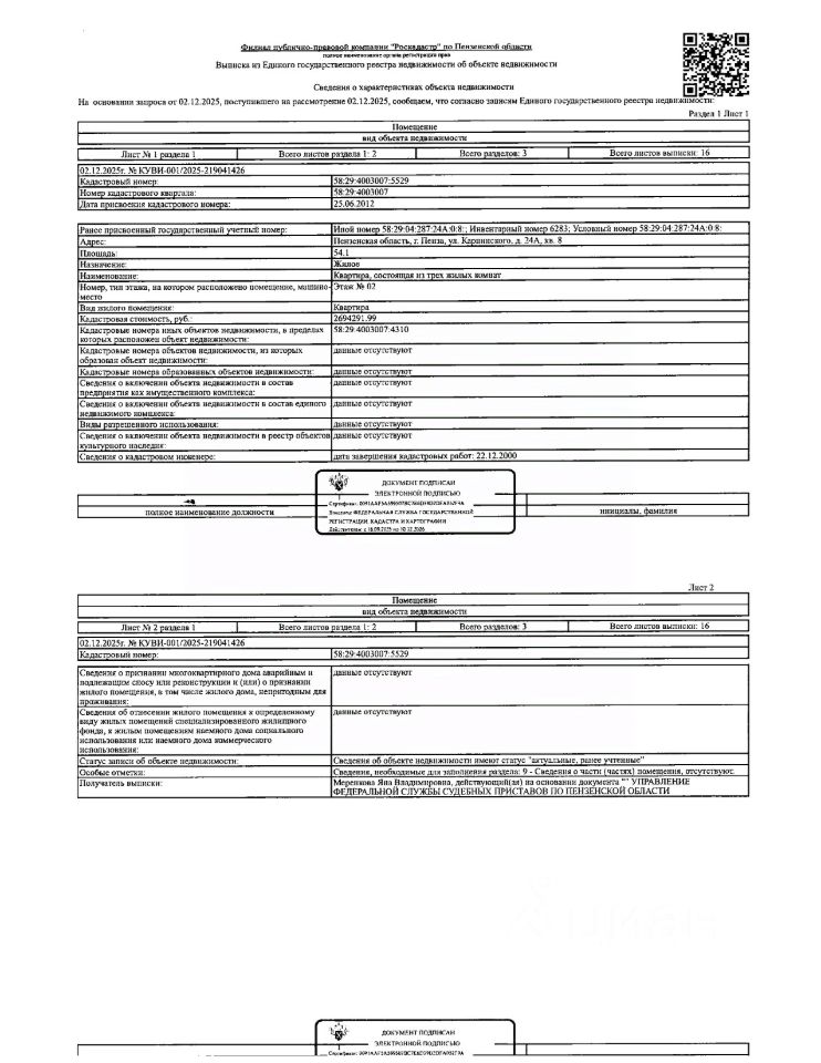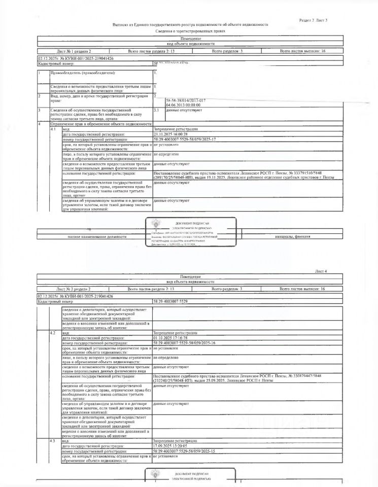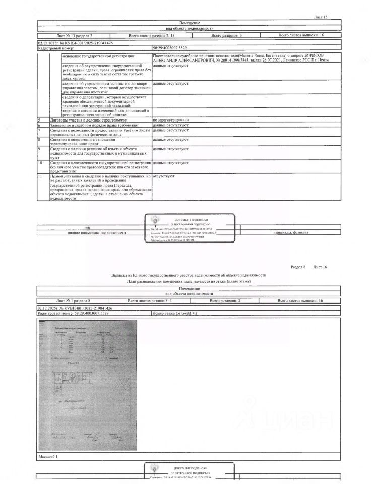 Жилое помещение (квартира 3-х комнатная) общей площадью 54,1 кв.м., кад. 58:29:4003007:5529, этаж 02, находящееся в пределах объекта недвижимости с кад. 58:29:4003007:4310, принадлежащее должнику Борисову А.А. Зарегистрировано трое граждан, в т.ч. один несовершеннолетний. Сведениями задолженности по коммунальным платежам и взносам на капитальный ремонт, а также о фактическом состоянии объекта недвижимости организатор торгов не располагает. Техническая документация и фотографии объекта отсутствуют у организатора торгов.
