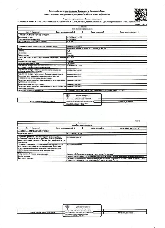 Жилое помещение (квартира) общей площадью 38,8 кв.м., кад. 58:29:2009005:14787, находящееся в пределах объекта недвижимости с кад. 58:29:4003002:437, принадлежащее должнику Московцеву А.М. Сведениями о зарегистрированных лицах, о фактическом состоянии имущества, о задолженности по коммунальным платежам и взносам на капитальный ремонт организатор торгов не располагает. Техническая документация и фотографии объектов организатору торгов не передавались.