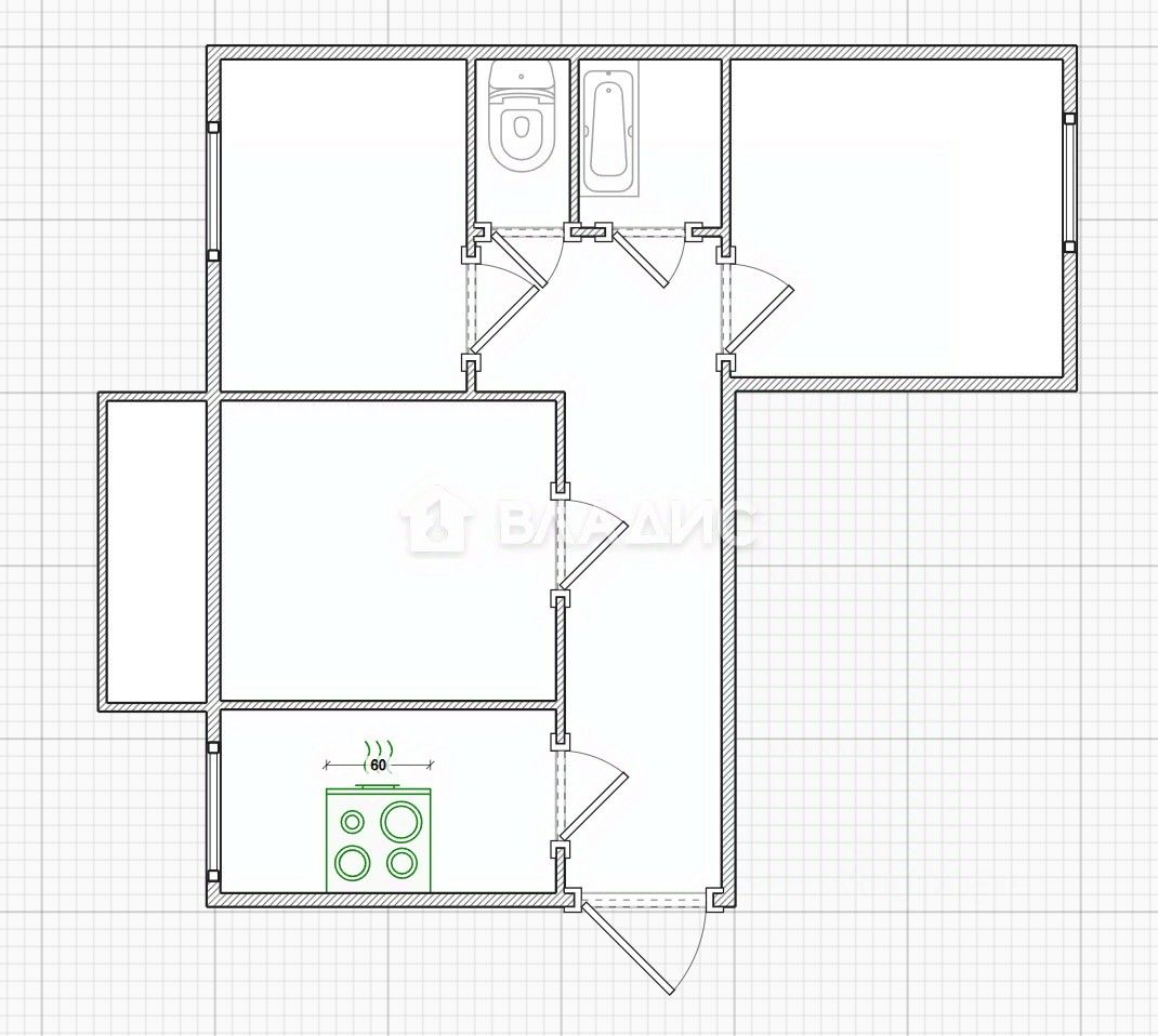 Три изолированные комнаты (17 + 8,7 + 12,3 кв. м) обеспечивают удобное зонирование пространства.