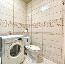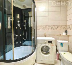 Санузел совмещенный в современной плитке, установлена душевая кабина.