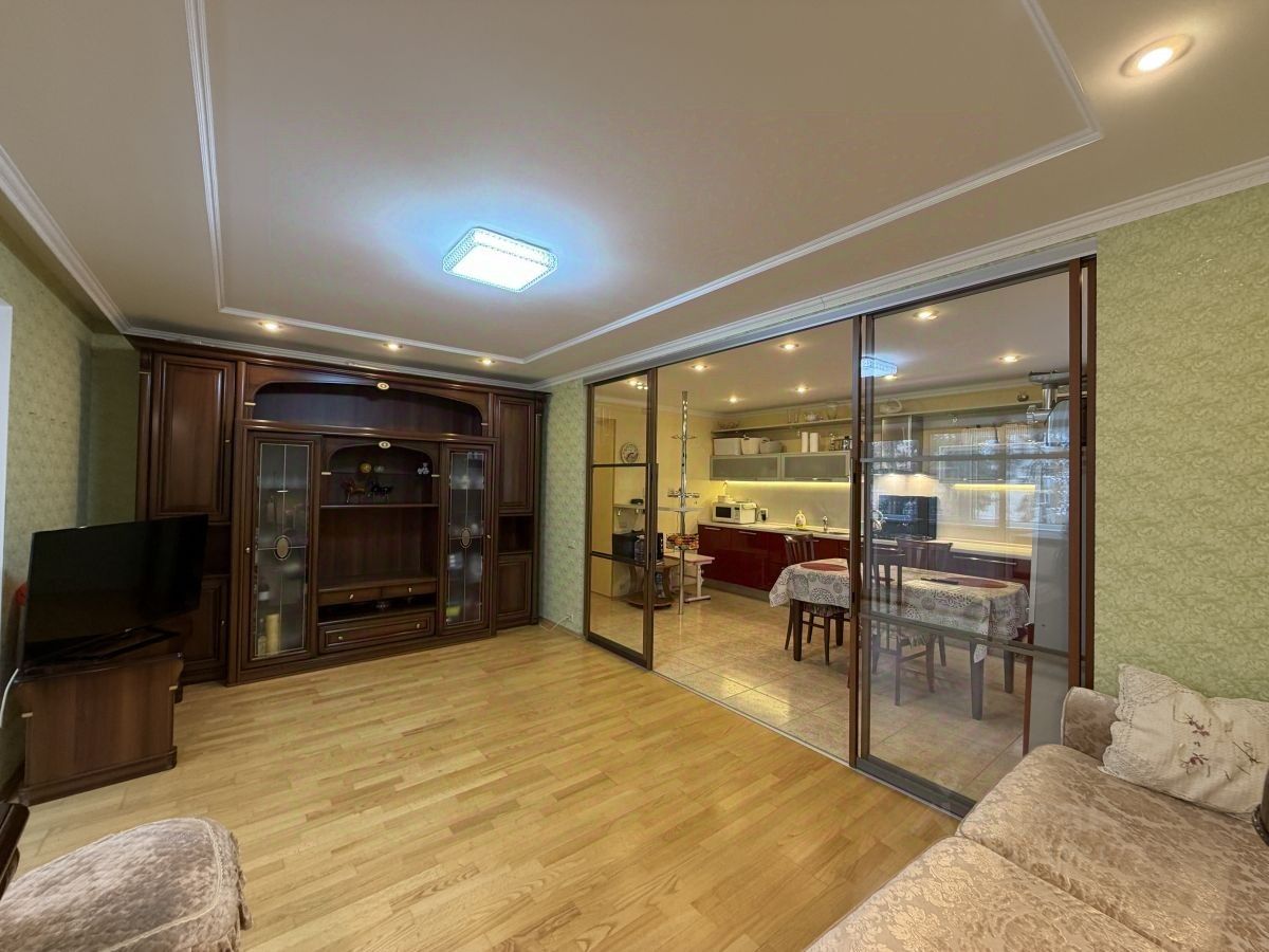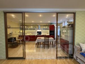 Остается кухонный гарнитур с доводчиками и встроенной техникой (посудомоечная машина, духовой шкаф фирмы BOSH, варочная поверхность, вытяжка). Есть небольшая барная стойка., Кондиционер в гостинной. Шкаф купе в прихожей.