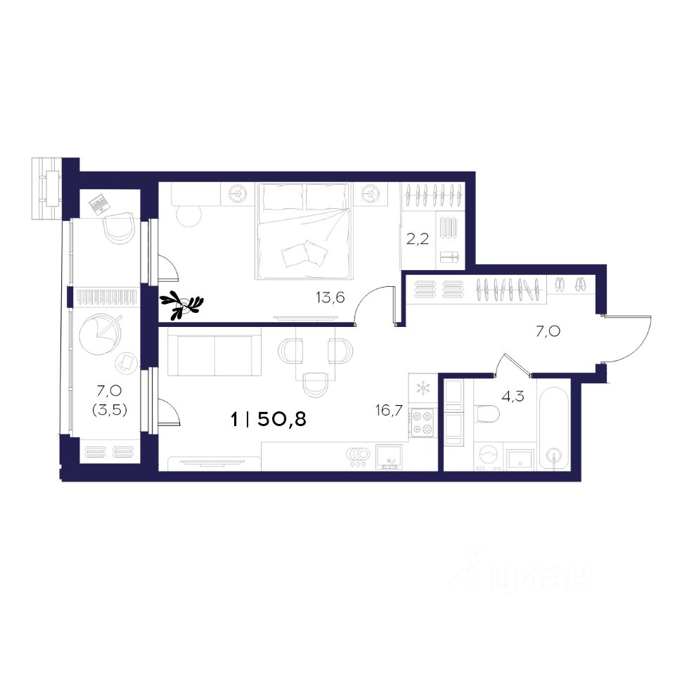 Общая площадь50,8 м²