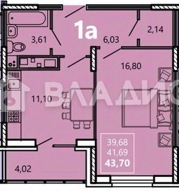 Общая площадь - 44,01 кв.м. (39,7 без учета лоджии)