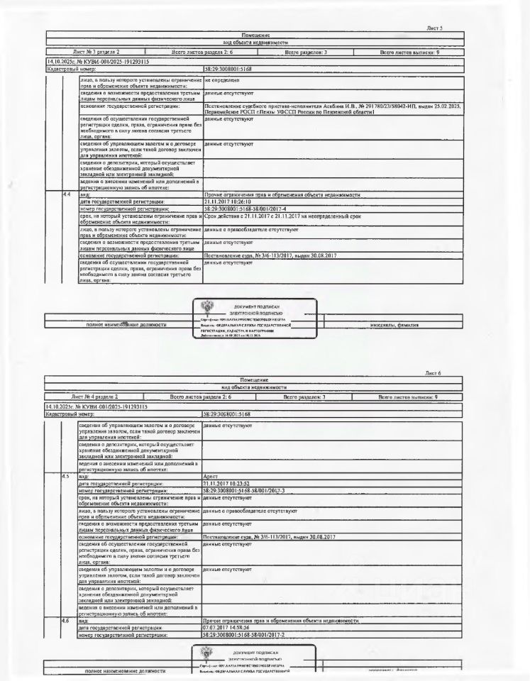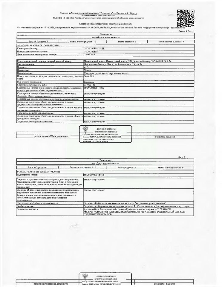 Жилое помещение (квартира 2-х комнатная) общей площадью 61,5 кв.м., кад. 58:29:3008001:5168, этаж 4, расположенное в пределах объекта недвижимости с кад. 58:29:3008001:4026, принадлежащее должнику Астахову А.И. По месту нахождения объекта зарегистрирован один гражданин. Сведениями о задолженности по коммунальным платежам и взносам на капитальный ремонт, а также о фактическом состоянии объекта недвижимости организатор торгов не располагает. Техническая документация и фотографии объекта отсутствуют у организатора торгов.