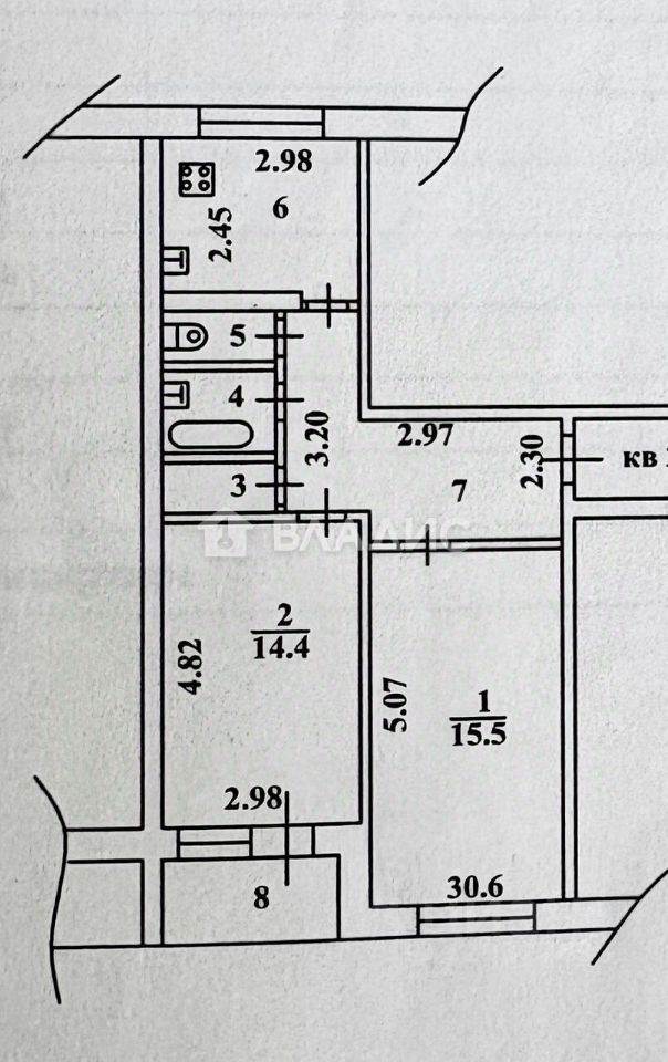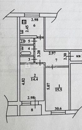 Жилaя площaдь: 29,9 кв.м. ( кoмнаты 15,5 кв.м., 14,4 кв.м.)
