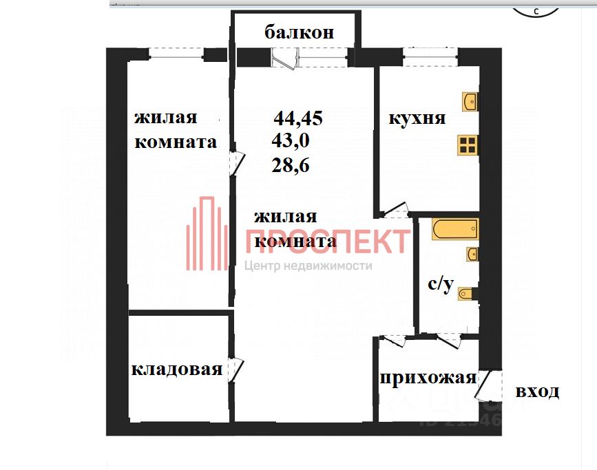 Общая площадь: 44,45 кв м