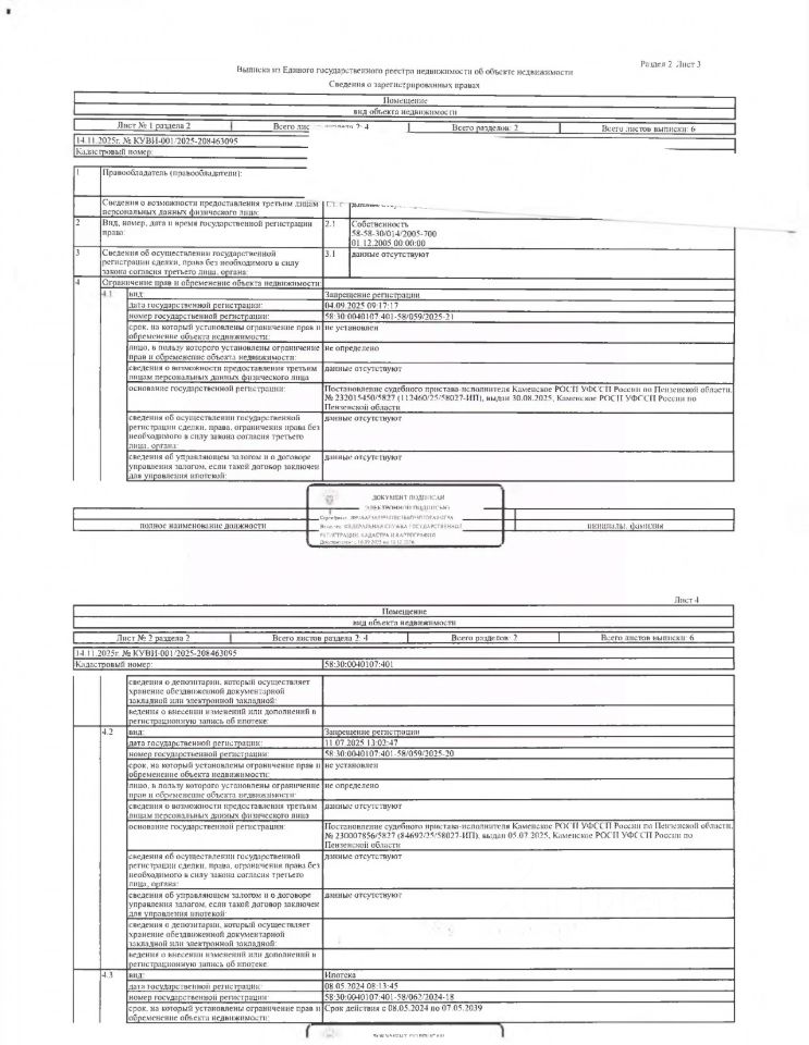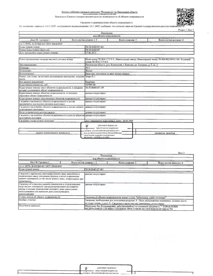 Жилое помещение (квартира) общей площадью 48,4 кв.м., кад. 58:30:0040107:401, находящееся в пределах объекта недвижимости с кад. 58:30:0040107:199, принадлежащее должнику Басенко А.П. По месту нахождения объекта недвижимости зарегистрирован один гражданин. Сведениями о размере задолженности по коммунальным услугам и взносам на капитальный ремонт, а также о фактическом состоянии объекта недвижимости, организатор торгов не располагает. Ключи, техническая документация и фотографии объекта отсутствуют у организатора торгов.