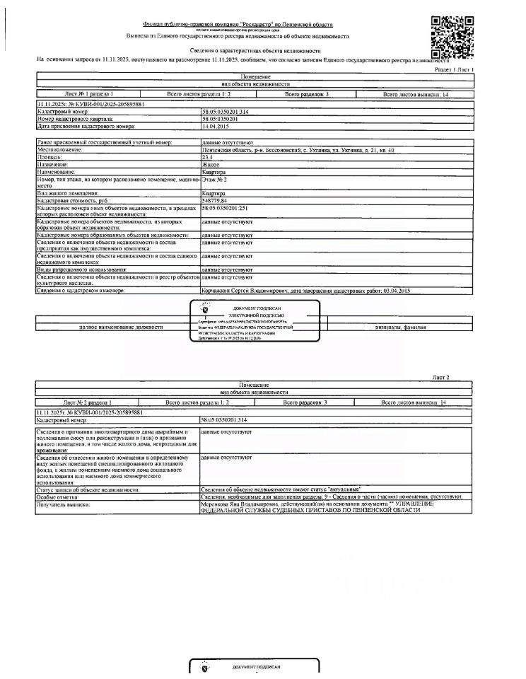 Жилое помещение (квартира) общей площадью 23,4 кв.м., кад. 58:05:0350201:314, находящееся в пределах объекта недвижимости с кад. 58:05:0350201:251, принадлежащая на праве общей совместной собственности должникам Елисееву В.А. и Елисеевой Н.С. По месту нахождения объекта недвижимости зарегистрирован один гражданин. Сведениями о размере задолженности по коммунальным услугам и взносам на капитальный ремонт, а также о фактическом состоянии объекта недвижимости, организатор торгов не располагает. Ключи, техническая документация и фотографии объекта отсутствуют у организатора торгов