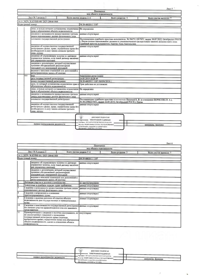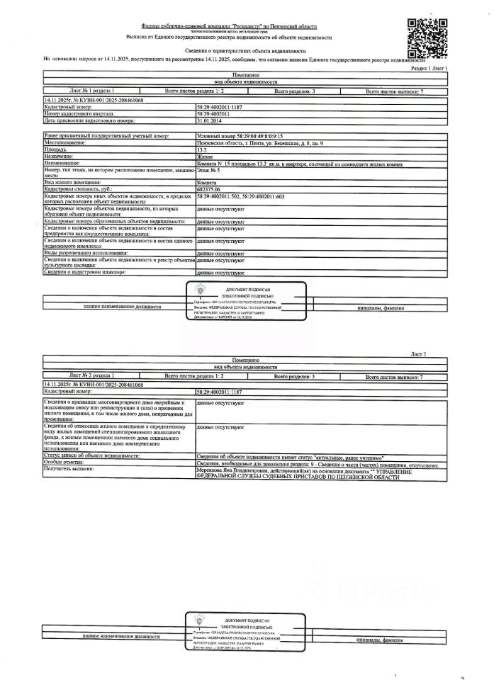 Жилое помещение (комната 15) площадью 13,2 кв.м., кад. 58:29:4002011:1187, находящееся в пределах объектов недвижимости с кад. 58:29:4002011:502 и 58:29:4002011:603, принадлежащее должнику Борисову В.А. Зарегистрировано двое гражданин. Сведениями о размере задолженности по коммунальным услугам и взносам на капитальный ремонт, а также о фактическом состоянии объекта недвижимости, организатор торгов не располагает. Ключи, техническая документация и фотографии объекта отсутствуют у организатора торгов.