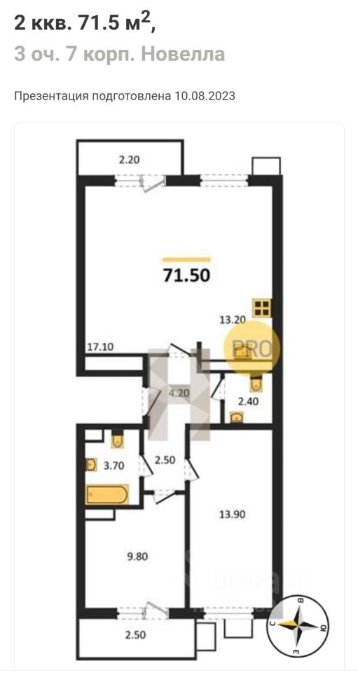 Общая площадь - 71,5кв. м (с учетом лоджий).
