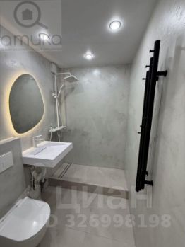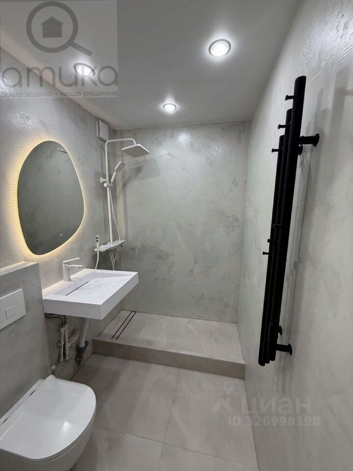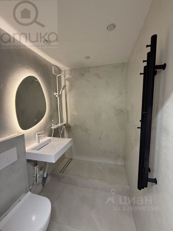 Санузел: 3 м² — совмещенный. Стены отделаны стильным и практичным микроцементом, на полу — крупноформатный керамогранит.