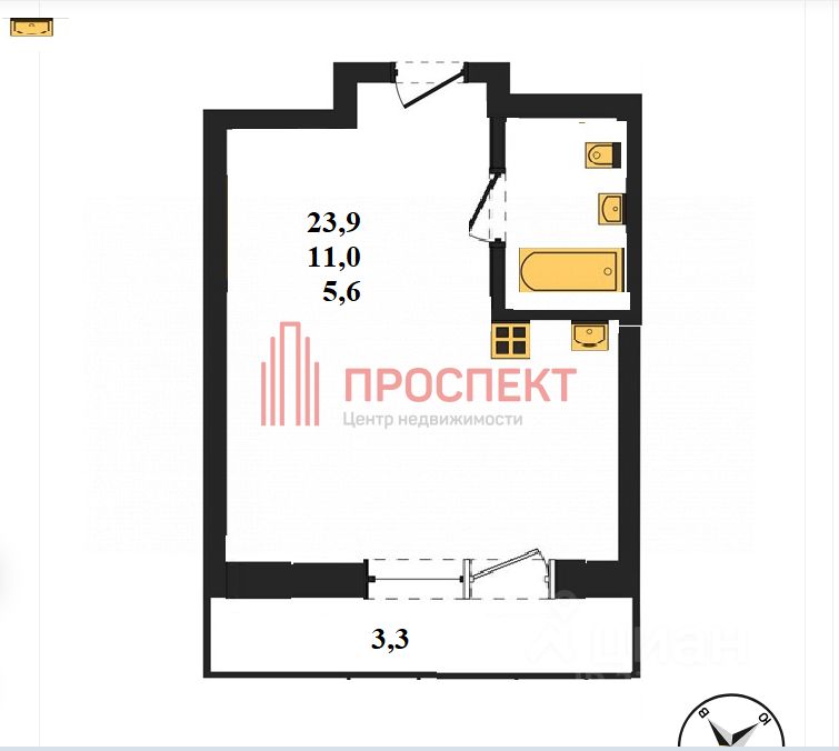 Площадь общая: 23,9 кв м ( без учета лоджии)