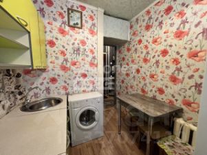 Кухня компактная, 5 м², оборудована необходимой техникой, включая холодильник, микроволновую печь и стиральную машину.