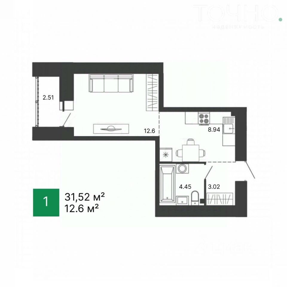Площадь квартиры: 31.52 кв.м. с учетом панорамной лоджии