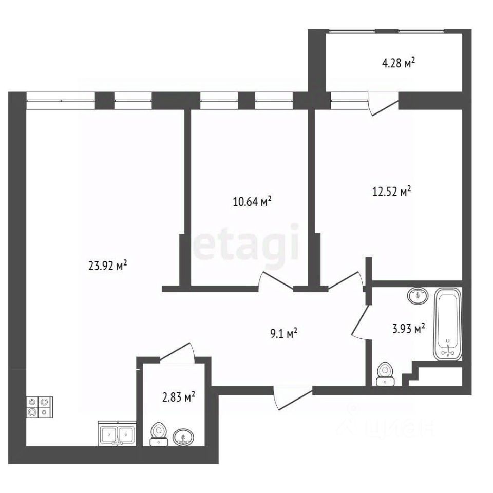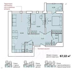 общая площадь — 67,22 м²;кухня-гостиная — 24 м²;две спальни - 10,64 кв.м. и 12,52 кв.м. ;два санузла - 3,93 кв.м. и 2.83 кв.м.; лоджия - 4,28 кв.м.