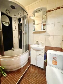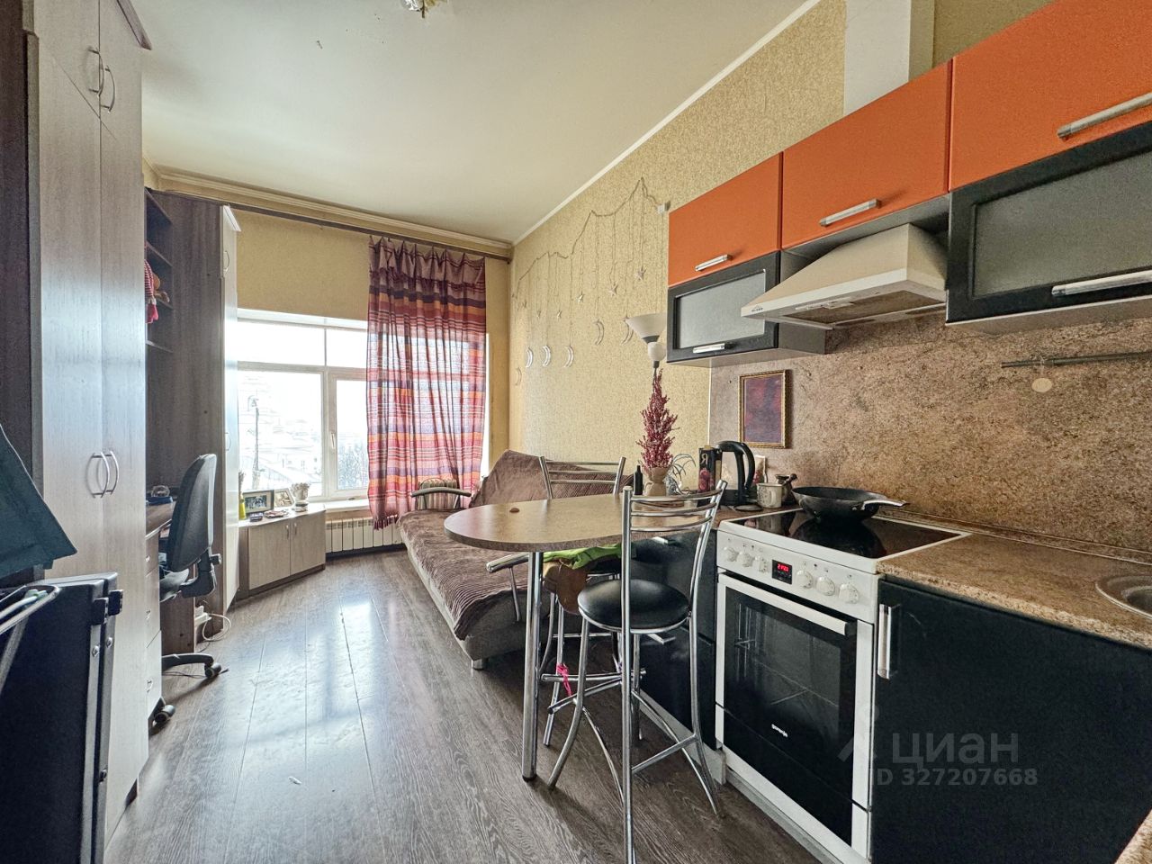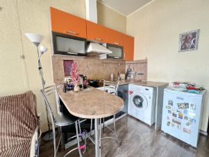 Студия очень теплая и светлая, в обычном жилом состоянии: натяжной потолок, на полу ламинат, стены оклеены обоями постельных тонов, пластиковое остекление с шикарным видом на город. Санузел в кафельной плитке современного образца, установлены счетчики ГВС и ХВС.