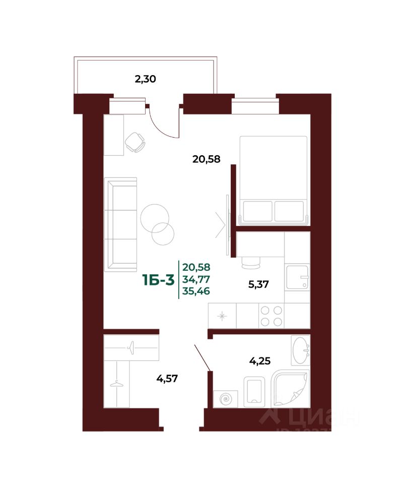 Общая площадь36,09 м²