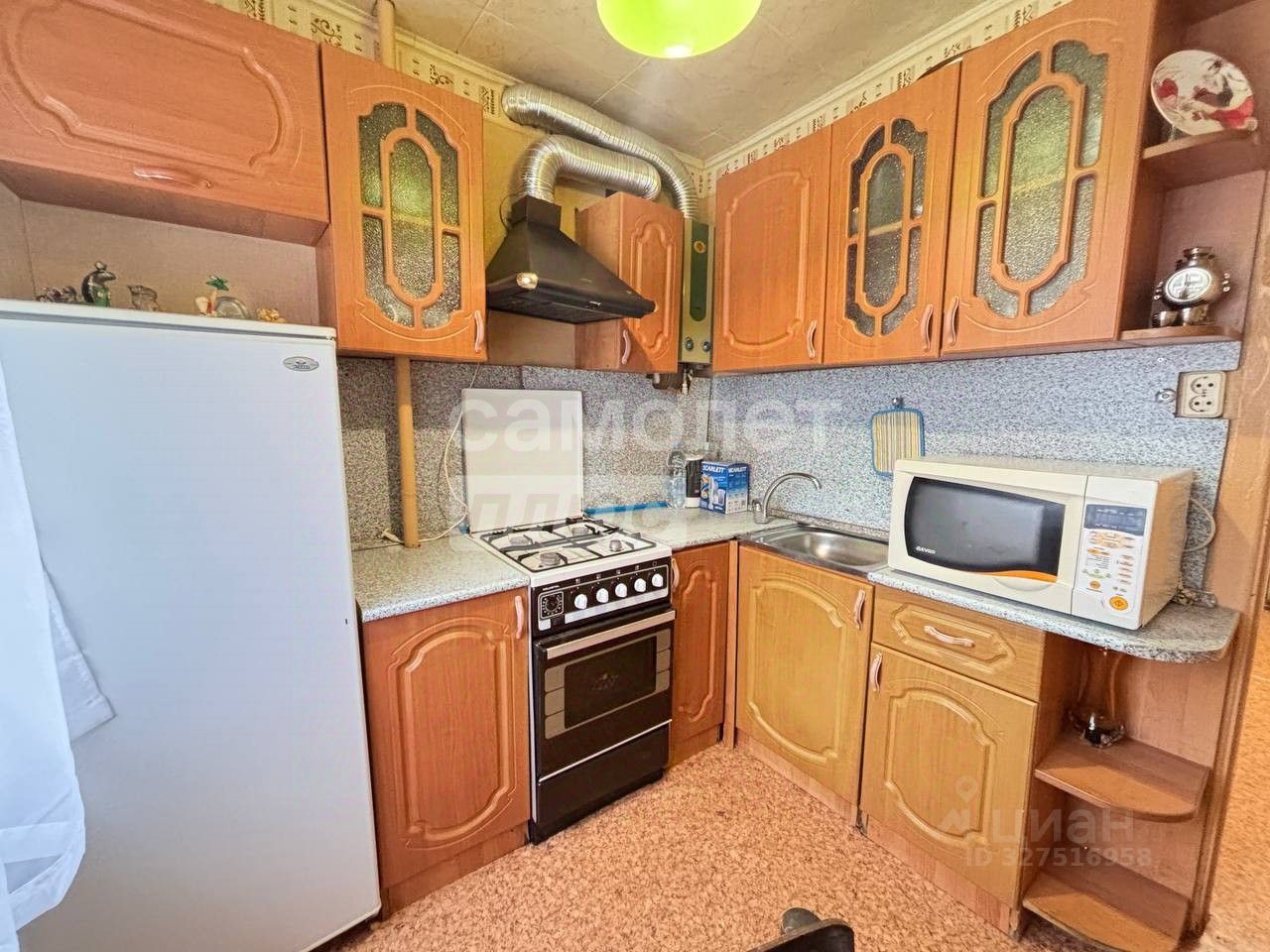 Вся мебель и техника остается (кроме стульев), а именно: кухонный гарнитур, вытяжка, стол, газовая колонка, холодильник, газовая плита, кровать, шкаф и стеллаж в зале, диван, компьютерный стол, новая дверь в зал.