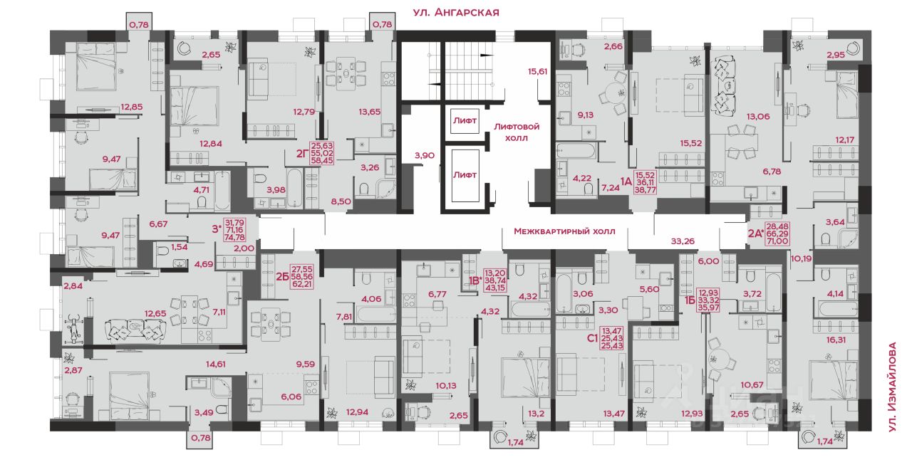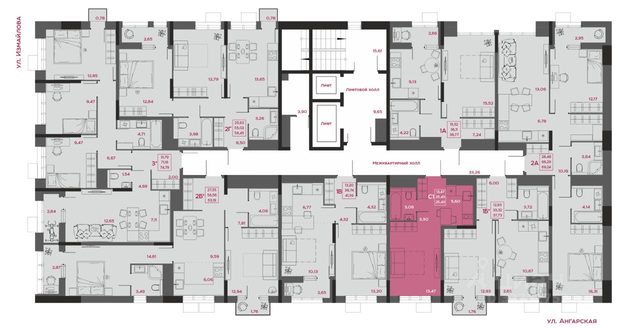 - коллекция квартир от 24,48 до 129,82 м²