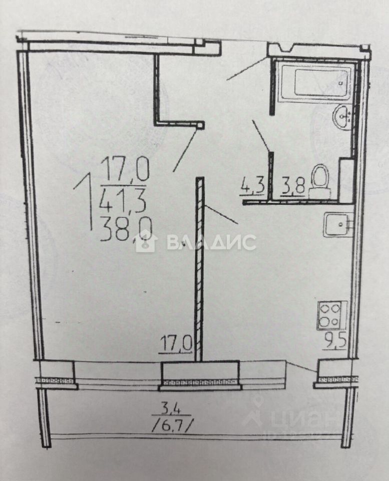 Общая площадь - 41, 3 кв.м. (с учетом лоджии)
