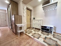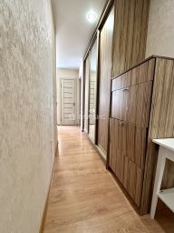 Входная металлическая дверь, установлены межкомнатные двери, пластиковое остекление окон и лоджии, лоджии с внутренней отделкой + теплый пол, натяжные потолки с точечным освещением, напольное покрытие керамогранит и ламинат, санузел раздельный в плитке.