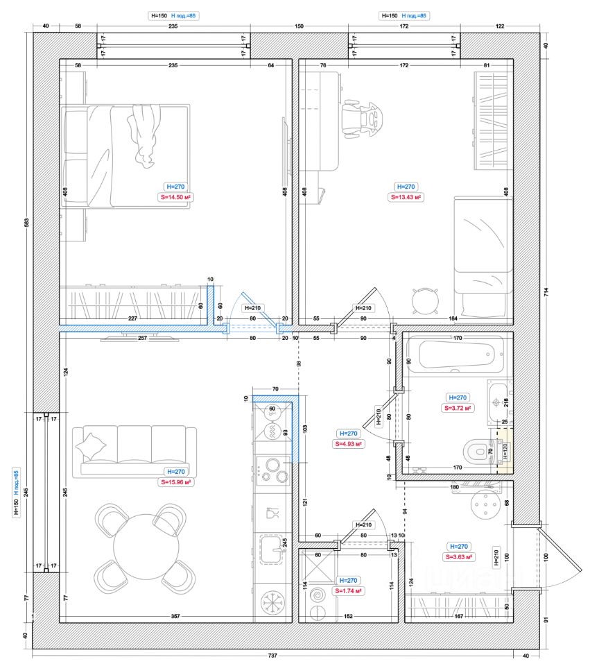 Санузел раздельный: 3,72 + 1,74 кв.м