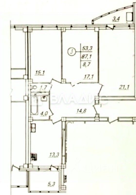 Жилaя площaдь: 53,3 кв.м. ( кoмнаты 21,1 кв.м., 17,1 кв.м. и 15,1 кв.м.)