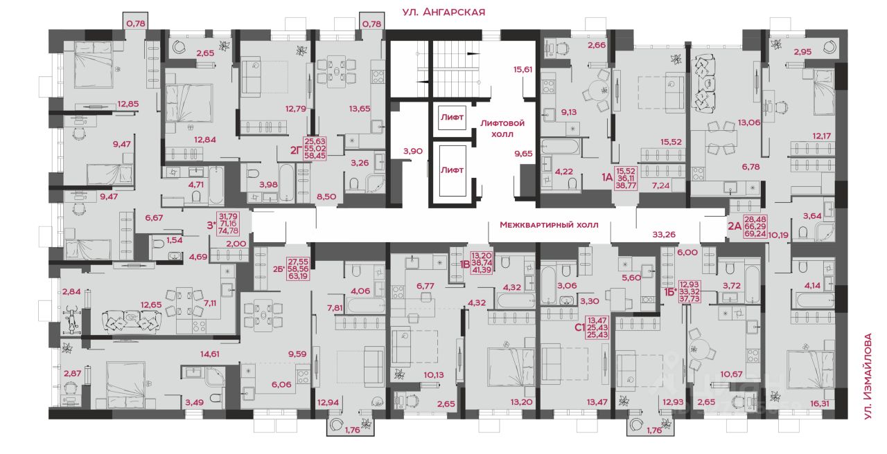 - коллекция квартир от 24,48 до 129,82 м²