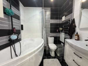 Выполнен современный дорогой ремонт: все поверхности выровнены и оклеены, на полу ламинат и плитка белого цвета, натяжные потолки.