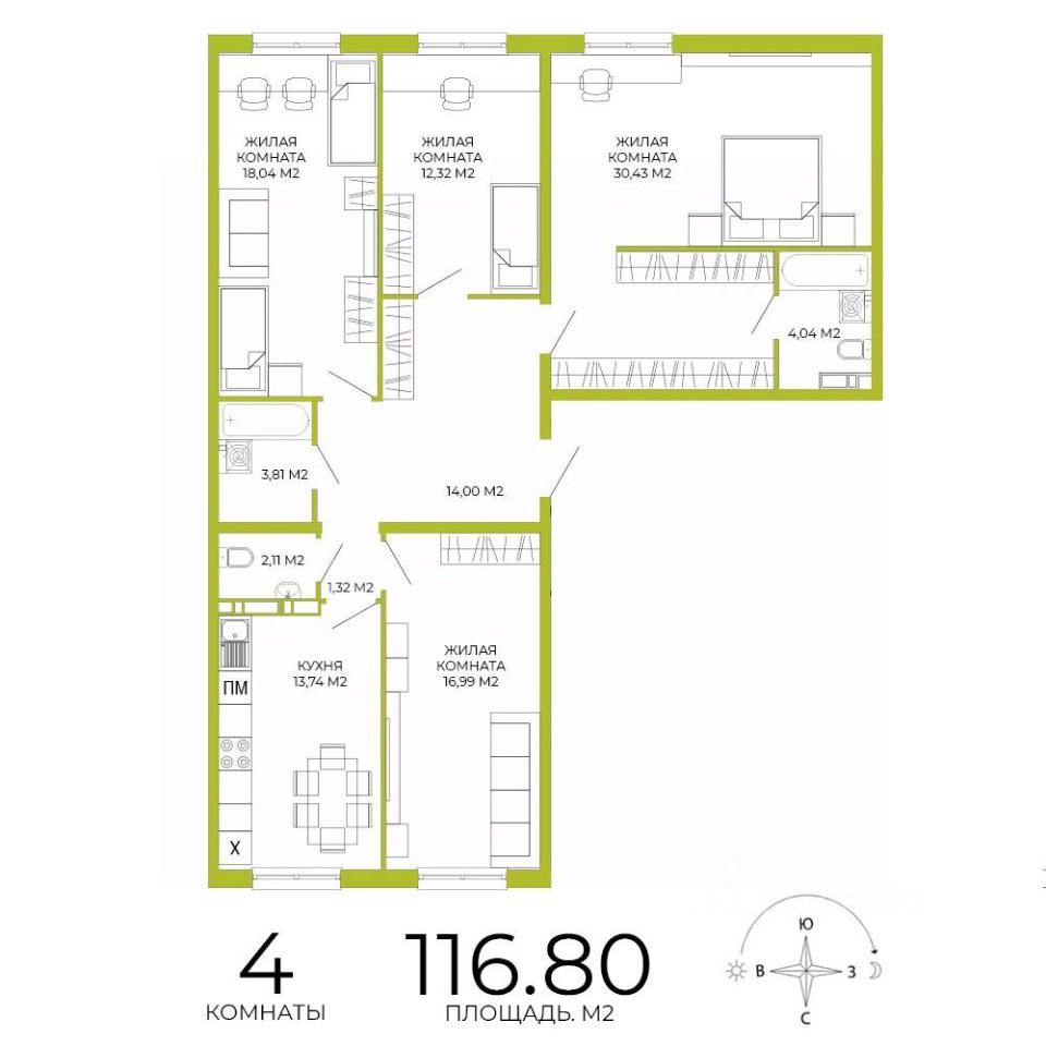 Продаётся 4-комнатная квартира в строящемся доме (дом 3), срок сдачи: IV-кв. 2026, общей площадью 116.8 кв.м., на 2 этаже. Дизайнерская отделка.