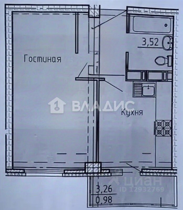 Общая площадь — 34,6 кв. м, из которых 15,2 кв. м — жилая площадь, 10 кв. м — кухня.