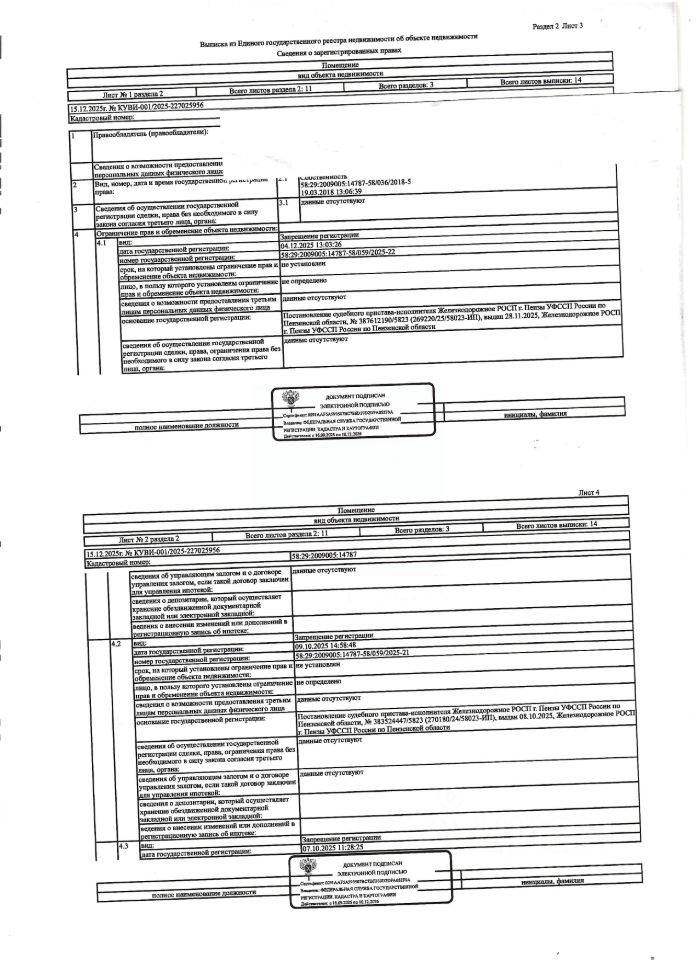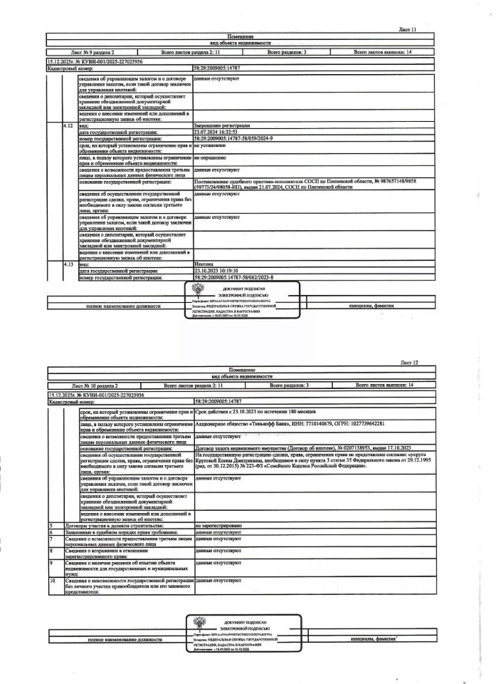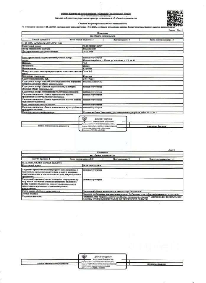 Жилое помещение (квартира) общей площадью 38,8 кв.м., кад. 58:29:2009005:14787, находящееся в пределах объекта недвижимости с кад. 58:29:4003002:14703, принадлежащее должнику Круговой Е.Д. Сведениями о зарегистрированных лицах, о фактическом состоянии имущества, о задолженности по коммунальным платежам и взносам на капитальный ремонт организатор торгов не располагает. Техническая документация и фотографии объектов организатору торгов не передавались.