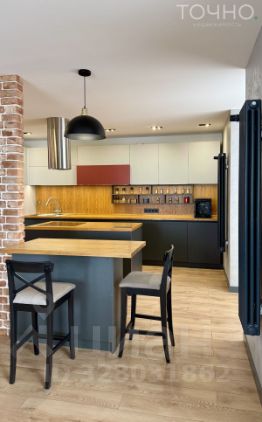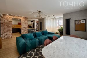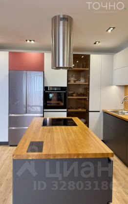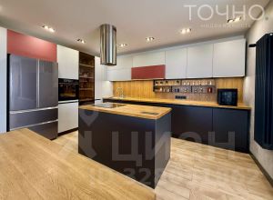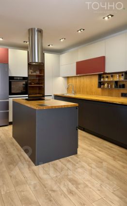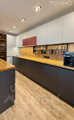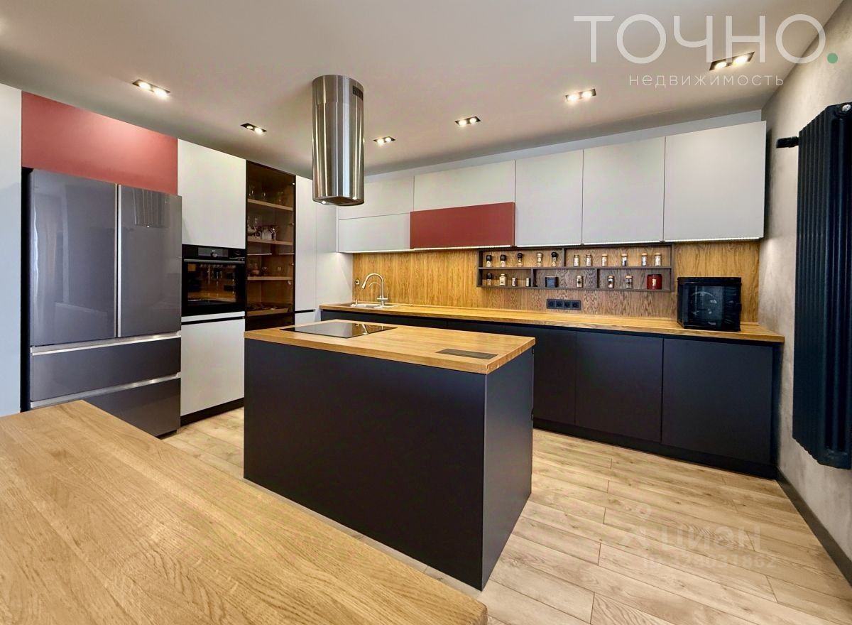 - Кухня: гарнитур с островом и встроенной бытовой техникой, отделка фасадов под натуральное дерево.
