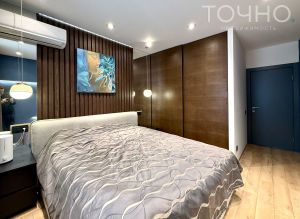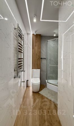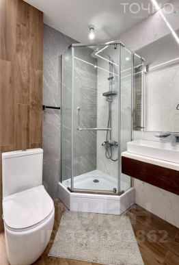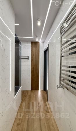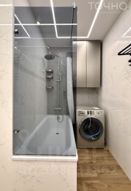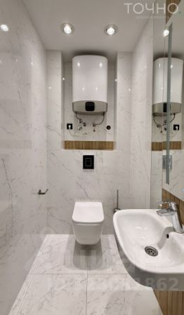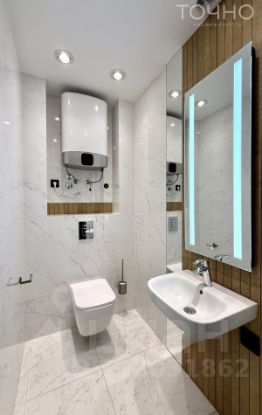 - В квартире два санузла. Оборудованы и полноценная ванная, и просторная душевая кабина. Установлен бойлер для бесперебойной подачи горячей воды. Отделка выполнена керамогранитом (текстуры мрамора, дерева и камня), предусмотрена выделенная постирочная зона.