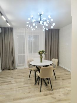 Состояние квартиры отличное, выполнен ЕВРО ремонт из качественных строительных материалов - санузелы в кафеле, хорошие межкомнатные двери, стены выровнены, натяжные потолки, входная металлическая дверь, красивые обои, кварцвинил на полу во всей квартире и на лоджии, счетчики, окна ПВХ, светодиодная подсветка на лоджии, в комнатах в зоне карнизов, над рабочей поверхностью кухонного гарнитура, установлены осветительные треки в гостиной.