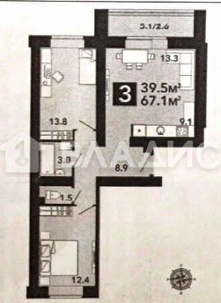 Общая площадь: 67 кв.м.( с учётом лоджии)