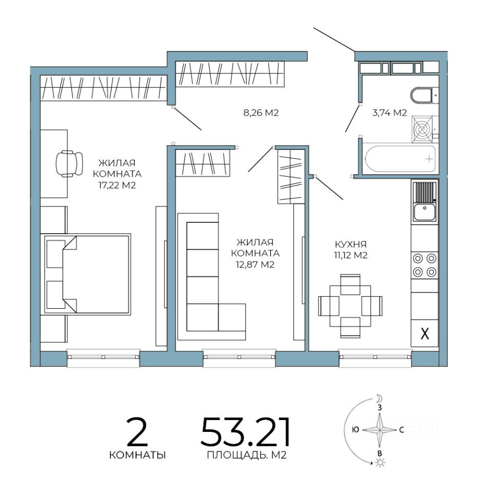 Продаётся 2-комнатная квартира в строящемся доме (дом 6), срок сдачи: IV-кв. 2026, общей площадью 53.21 кв.м., на 10 этаже. Дизайнерская отделка.