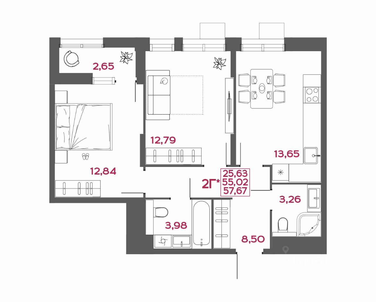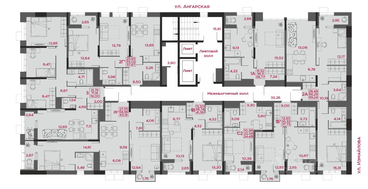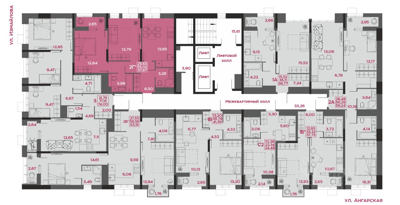 - коллекция квартир от 24,48 до 129,82 м²