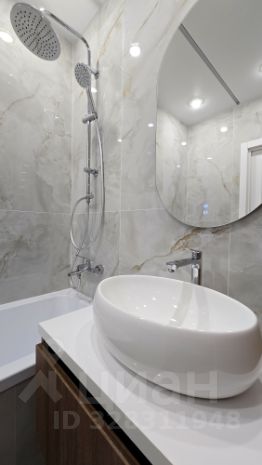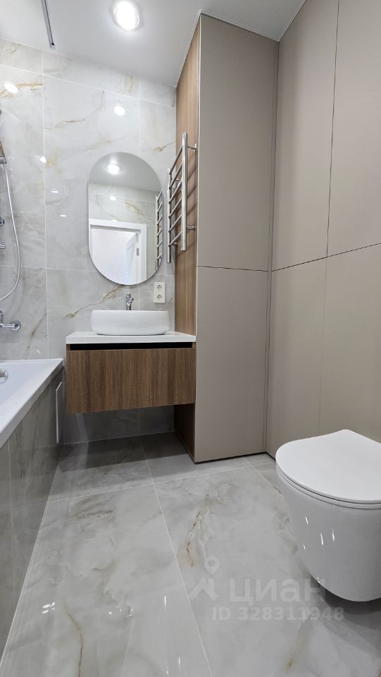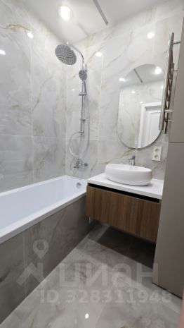 - совмещённый санузел в керамограните, смесители, инсталляция и акриловая ванна AM.PM, раковина Lavinia Boho, установлена мебель из пластика AGT