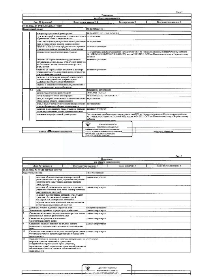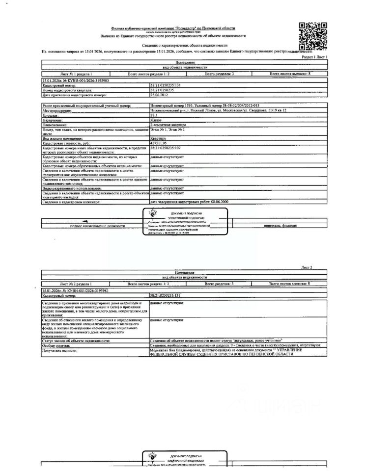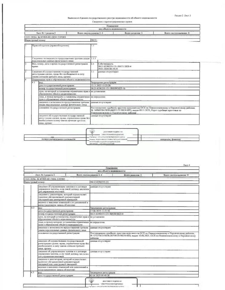 Жилое помещение (квартира 2-х комнатная) общей площадью 28,3 кв.м., кад. 58:21:0250235:131, этаж 1,2, расположенное в пределах объекта недвижимости с кад. 58:21:0250235:107, принадлежащее должнику Коломиец С.В. Сведениями о зарегистрированных лицах, о задолженности по коммунальным платежам и взносам на капитальный ремонт, а также о фактическом состоянии объекта недвижимости организатор торгов не располагает. Техническая документация и фотографии объекта отсутствуют у организатора торгов