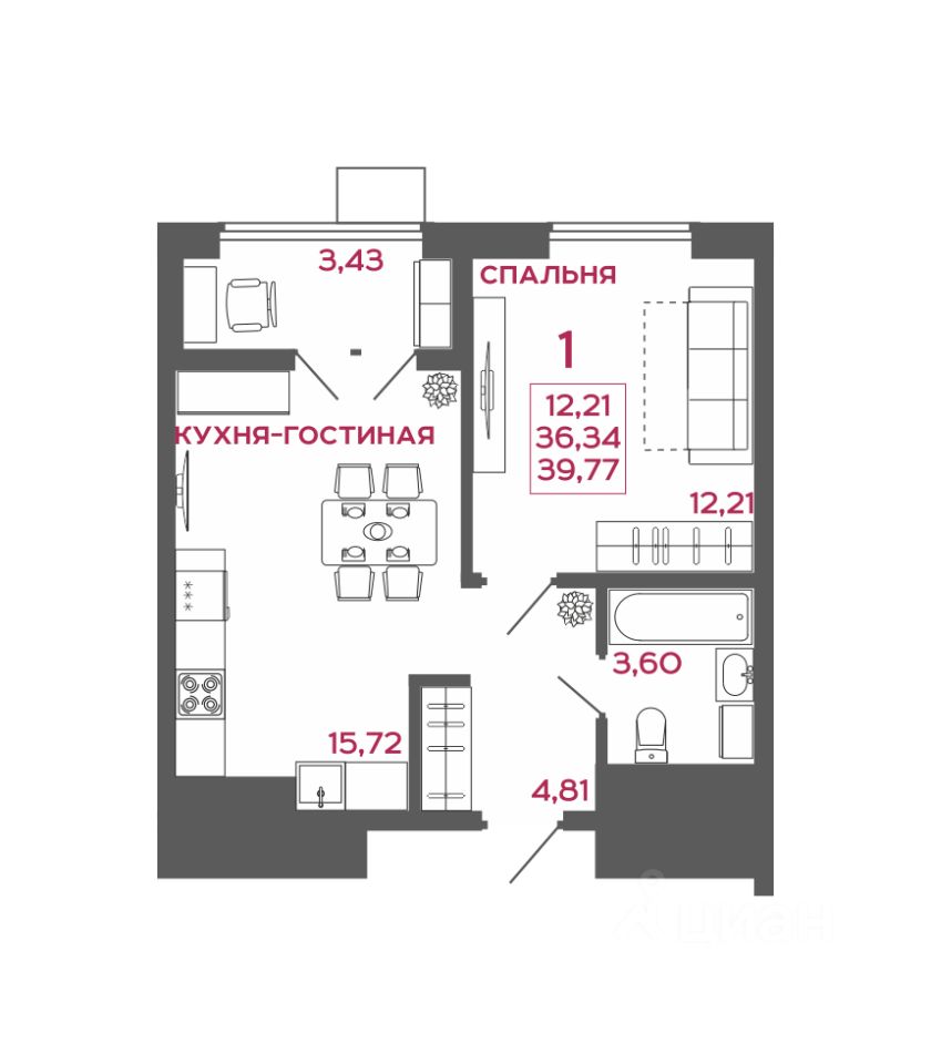 Общая площадь39,77 м²