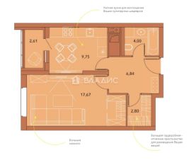 Общая площадь квартиры - 41,1 кв.м ( без учета лоджии)