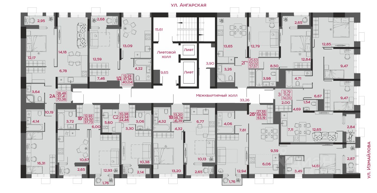 - коллекция квартир от 24,48 до 129,82 м²