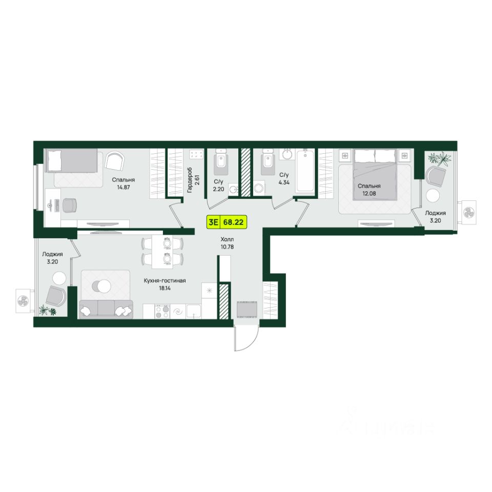 Общая площадь68,22 м²