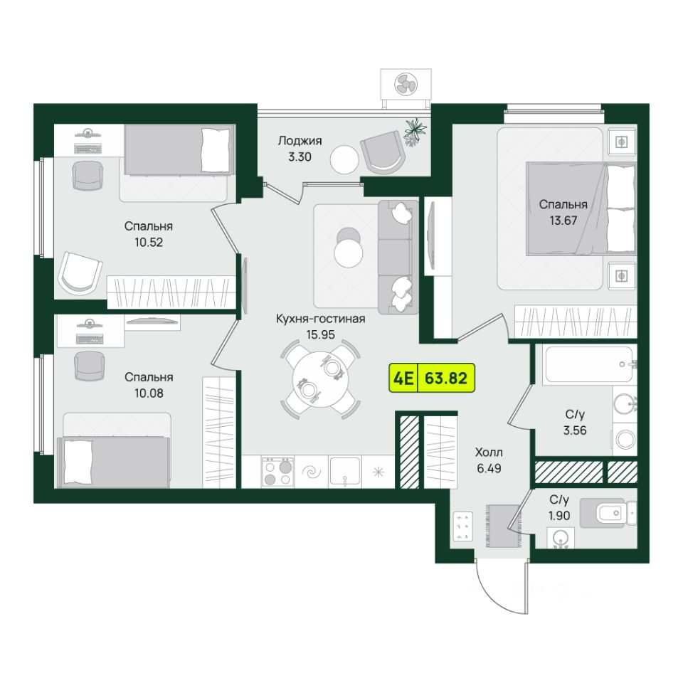 • три отдельные спальни (13.67 м², 10.52 м², 10.08 м²)