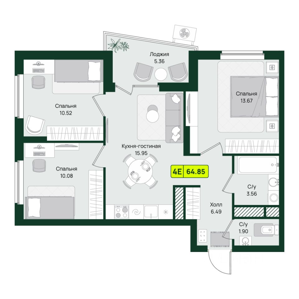 • три отдельные спальни (13.67 м², 10.52 м², 10.08 м²)