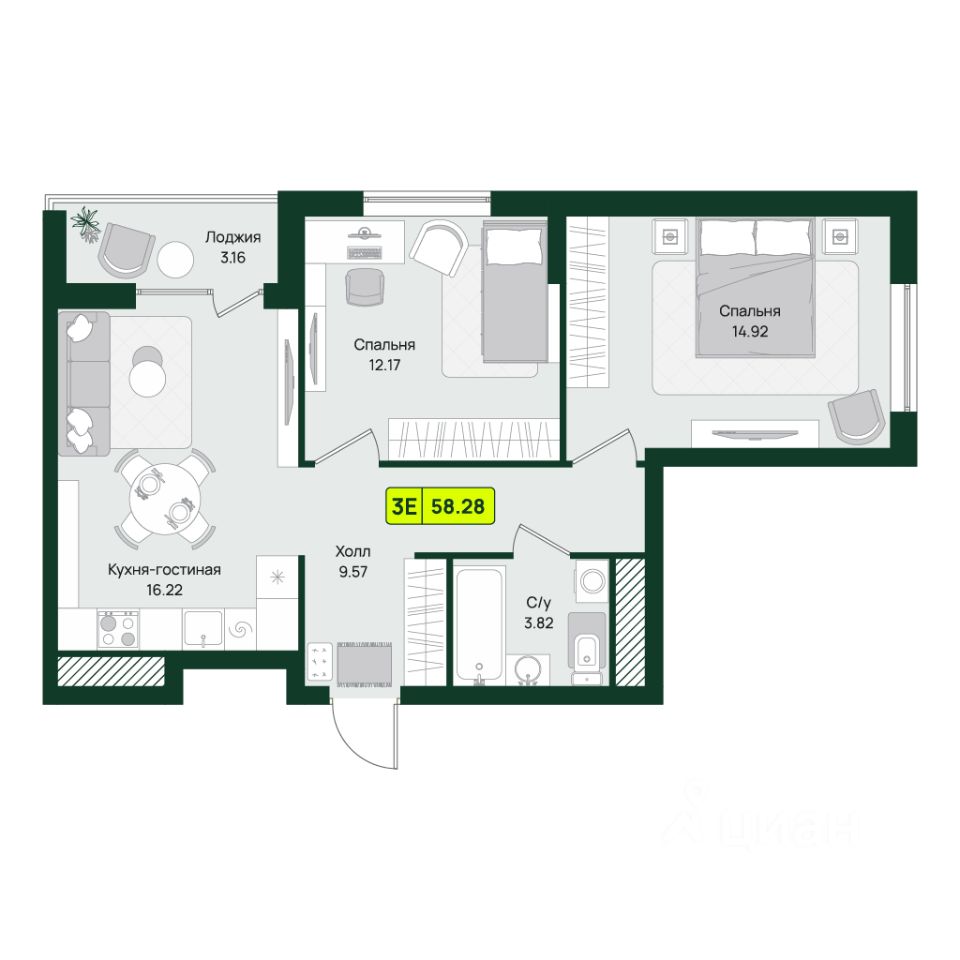 • две отдельные спальни (12.17 м² и 14.92 м²)